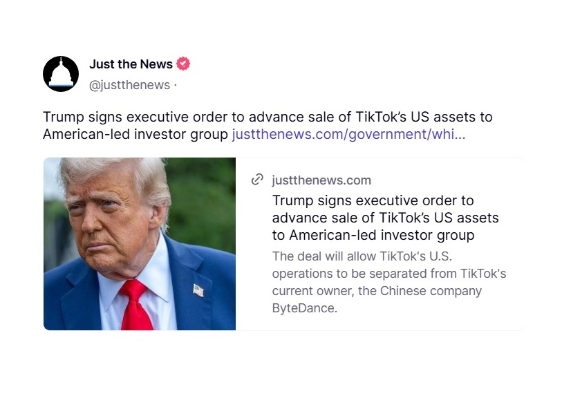 Informacje o otwarciu przez prezydenta USA drogi do przejęcia TikToka amerykańskim firmom podano w czwartek po południu (wieczorem polskiego czasu). Umowa – jak podkreślają media w Stanach Zjednoczonych – umożliwi oddzielenie działalności TikToka w USA od chińskiej firmy ByteDance, obecnego właściciela TikToka. Informacje na ten temat przekazała amerykańska platforma społecznościowa Truth Social cytując portal Just the News.